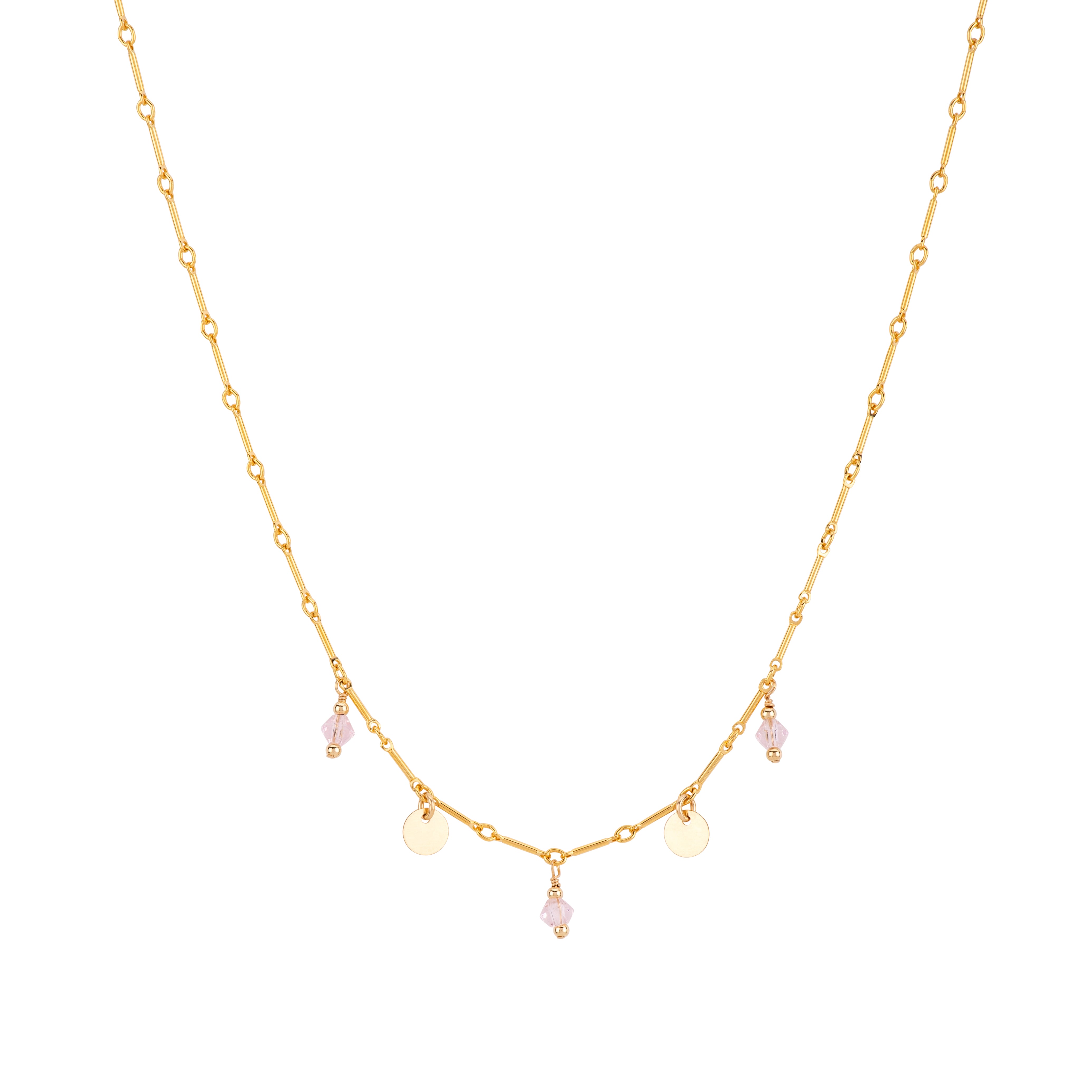 The Pink Sands Necklace is 16 inch and is 14k gold filled. It is also made with swarovski coloured beads. Wear as a set with the matching hoop earrings!