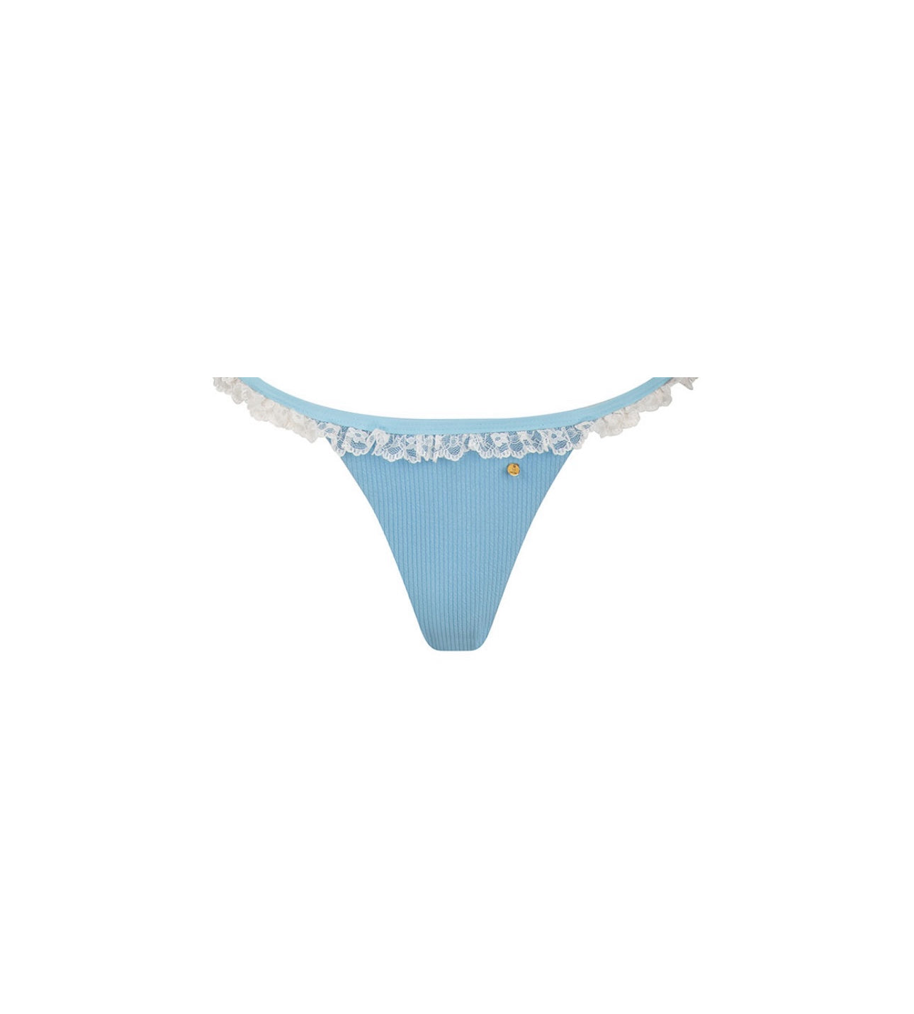 Sugar Berry Lace bikini bottoms by Ajay Swim have thin straps and have a flattering higher cut shape, elongating your legs with cheeky coverage. These bottoms are finished with a delicate white lace trim.