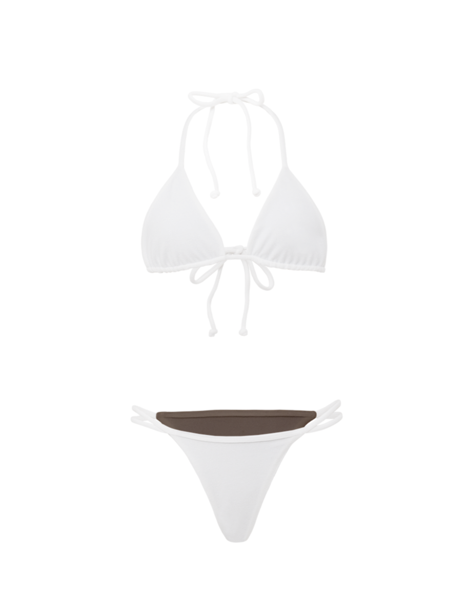 This double side strap style bikini bottom is made with a luxurious Terry towelling fabric and is reverisble with a latte colour on the inside, so you can change up the colour, depending on your mood. Wear as a set or mix and match the Bounty bikini bottoms with any Ajay Swim designs.