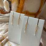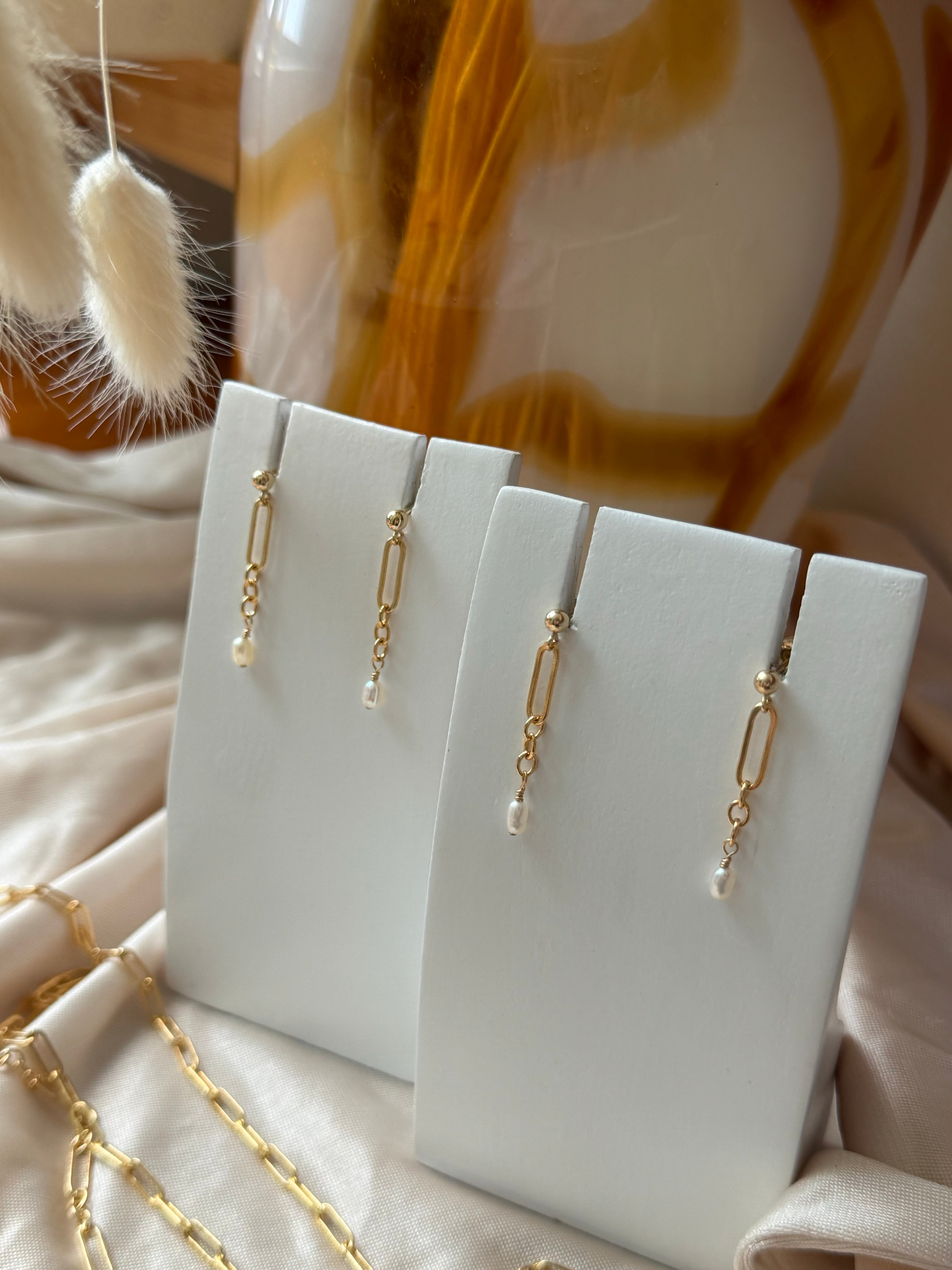 Delicate and timeless, these 14k gold filled drop earrings feature elongated gold links finished with a natural freshwater pearl. They’re tarnish resistant, lightweight, and perfect for everyday wear.