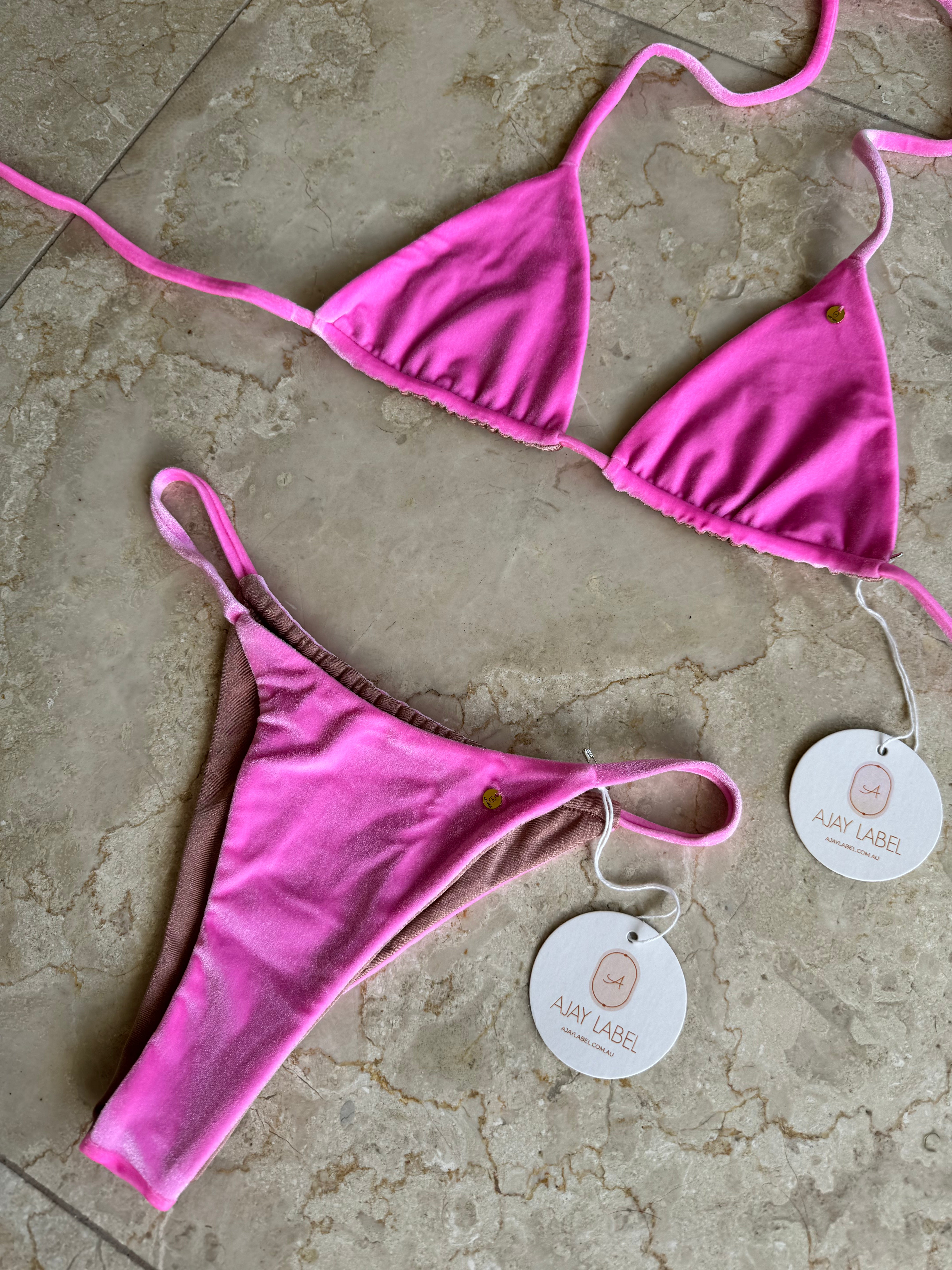 This style bikini bottom is made with a luxurious velvet fabric and is reverisble with a .... colour on the inside, so you can change up the colour, depending on your mood. Wear as a set or mix and match the Miami bikini bottoms with any Ajay Swim designs.