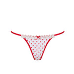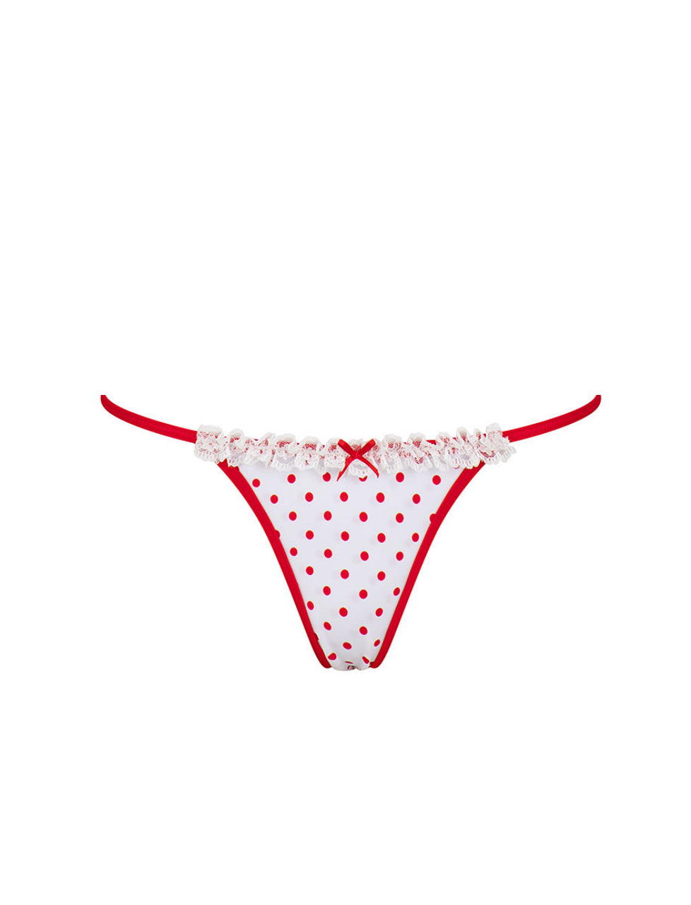 Strawberries & Cream bikini bottoms by Ajay Swim have thin straps and have a flattering higher cut shape, elongating your legs. These bottoms are finished with a delicate white lace trim and bow.