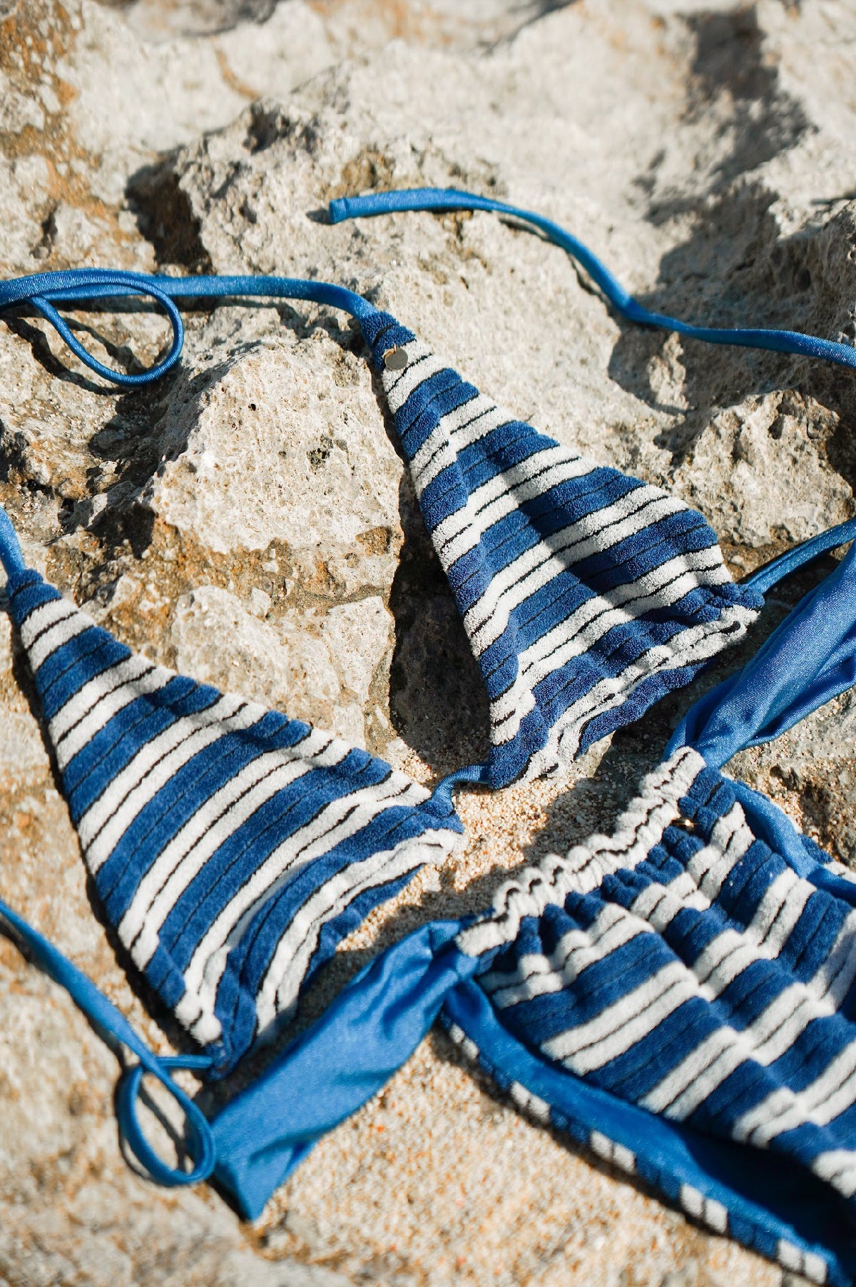 This triangle style bikini top is made with a white, blue and black stripe terry towelling luxurious fabric.