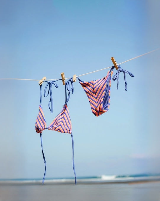 This triangle style bikini top is made with a pink, blue and orange stripe terry towelling luxurious fabric. Wear as a set or mix and match the Sunset Stripe bikini top with the matching bottoms, and beach shorts.