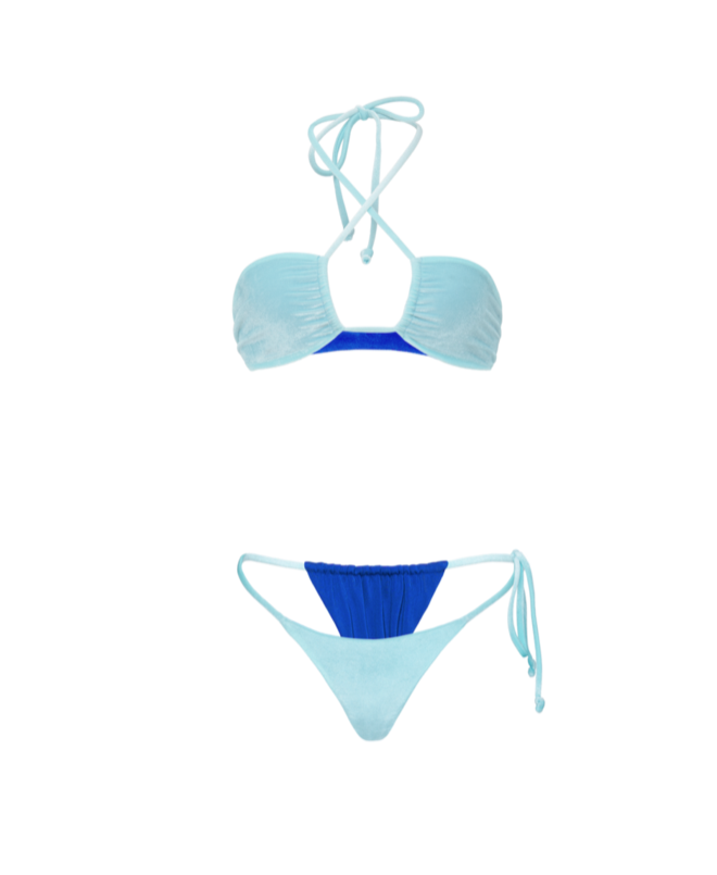 This halter style bikini top is made with a luxurious velvet material and is reverisble with a royal blue on the inside, so you can change up the colour, depending on your mood. Wear as a set or mix and match the Day Dream bikini top with any Ajay Swim designs.